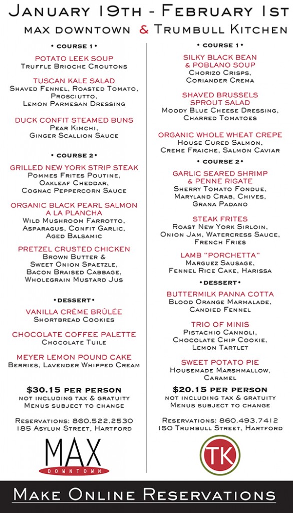 Thirsty Thursdays @ Max – as always, February brings us a selection of fun promotions for Thursday nights at Max locations. Max Amore in Glastonbury and Max a Mia in Avon – 1/2 priced bottles of wine all night. No limit on prices – all wine list wines are 1/2 off. Max Burger West Hartford – 1/2 priced Cans of Beer. All Cans are 1/2 priced all day. Trumbull Kitchen will also be joining the 1/2 priced Beer Cans on Thirsty Thursdays starting in February.